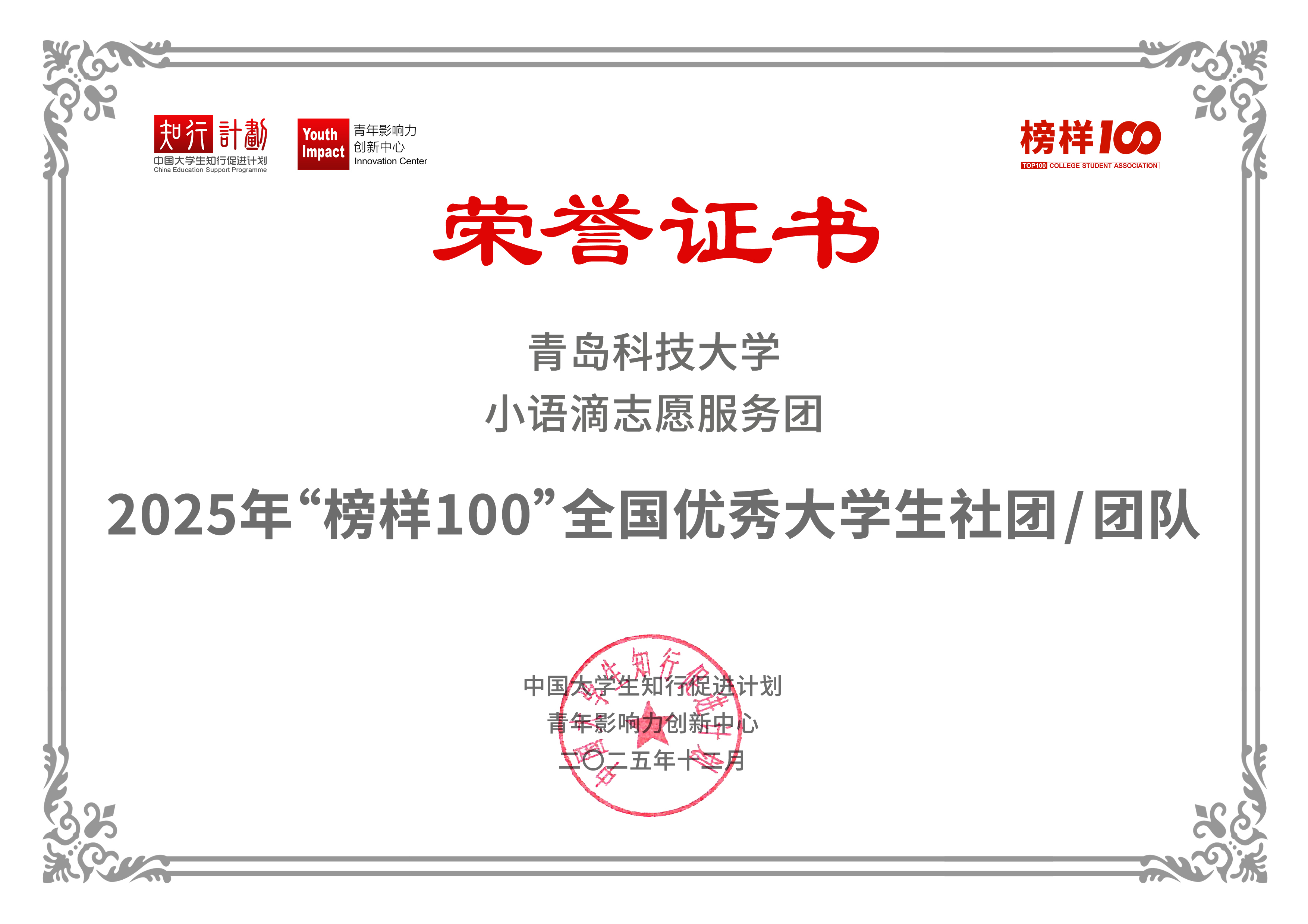 近日,2025年“榜样100”全国优秀大学生社团及团队(第二批)榜单正式发布。该榜单由中国大学生知行促进计划与青年影响力创新中心联合发布,全国共有376所高校的1320支团队参与申报。beat365官网“小语滴”志愿服务团凭借扎实的服务成效和突出的社会影响力,在激烈竞争中脱颖而出,展现出beat365官网青年志愿服务的卓越风采。