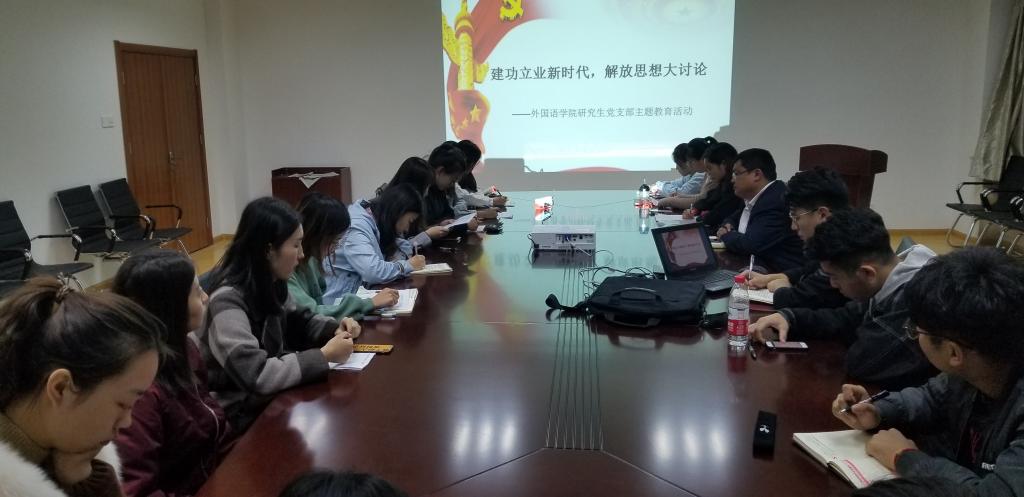 2018年10月29日,beat365中文唯一官网研究生党支部在党员开展了以“建功立业新时代,解放思想大讨论”主题教育活动,本次学习采取视频观看和学习讨论相结合的方式,由党支部书记宋飞同志主持。