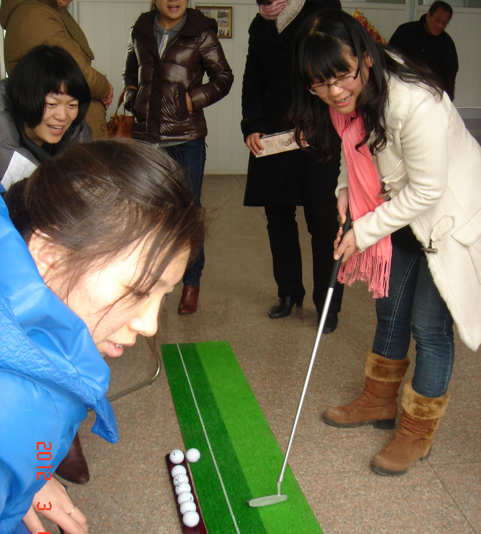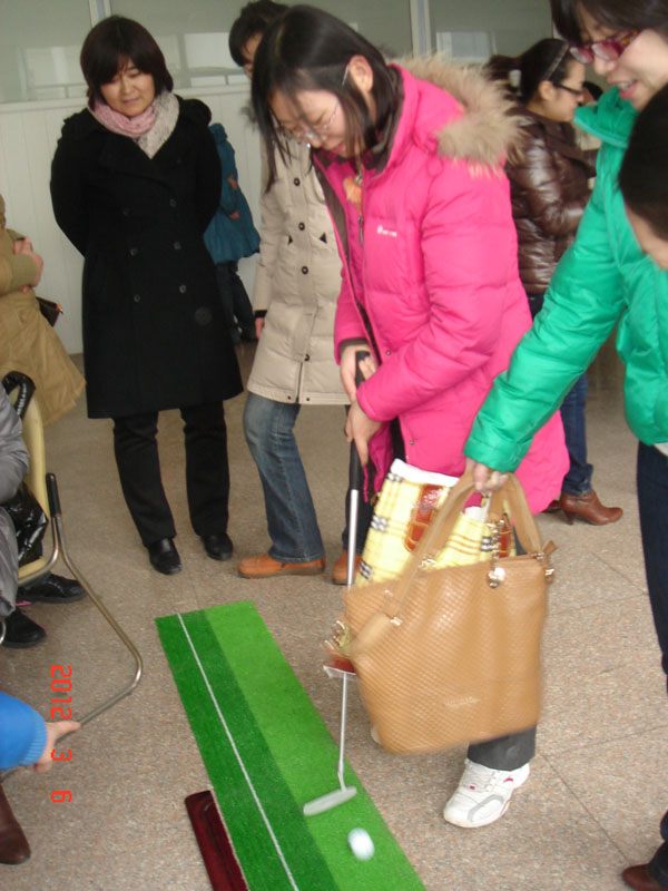 比赛于午饭后的12:30开始,规则是:每人打10个球,进7-9球者为一等奖,进4-6球者为二等奖,进1-3球者为三等奖。比赛看似简单,但对于许多从未摸过高尔夫球杆的老师们来说,要拿到一等奖并非易事。当然,老师们可不是抱着拿奖品的心态来参加活动的!大家摩拳擦掌,跃跃欲试,每当进一个球,大家就会发出一阵欢呼声!