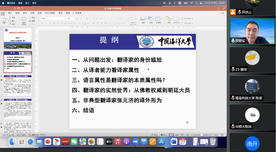 9月27日下午,中国海洋大学beat365中文唯一官网博士生导师贺爱军教授应学院邀请,在线做了题为《翻译家的本质属性探究》的学术讲座。讲座由院长尹洪山主持,学院师生及省内外学者300余人聆听了讲座。