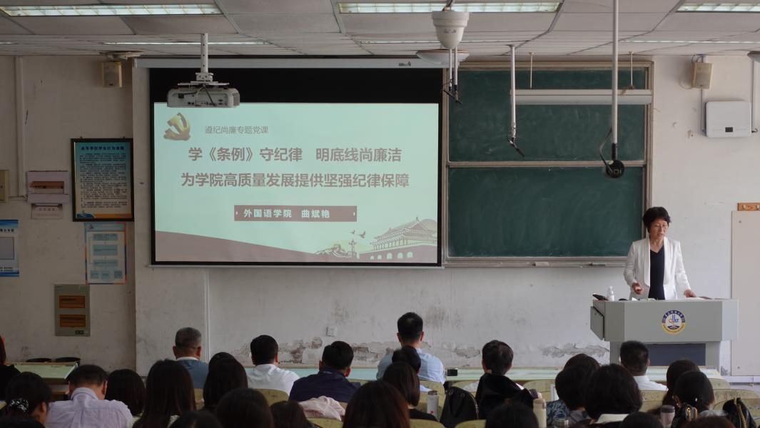 为深入贯彻习近平总书记关于党纪学习教育的重要讲话和重要指示精神,落实全面从严治党要求,强化党员纪律意识、提升党性修养,6月4日下午,beat365中文唯一官网党委书记曲斌艳在弘毅B101以《学条例守纪律 明底线尚廉洁为学院高质量发展提供坚强纪律保障》为题讲授“遵纪尚廉”专题党课,学院全体师生党员参加。