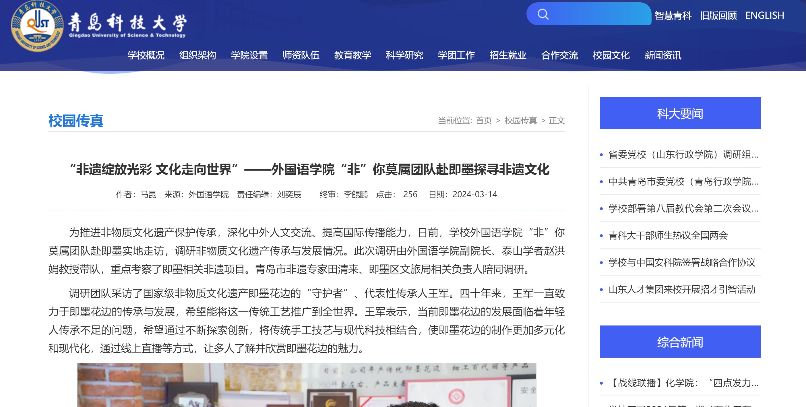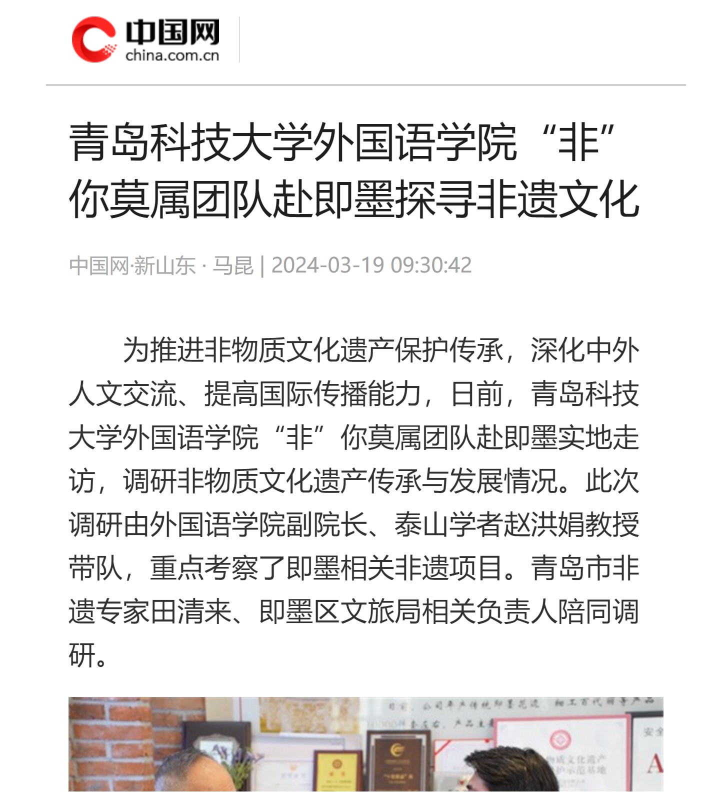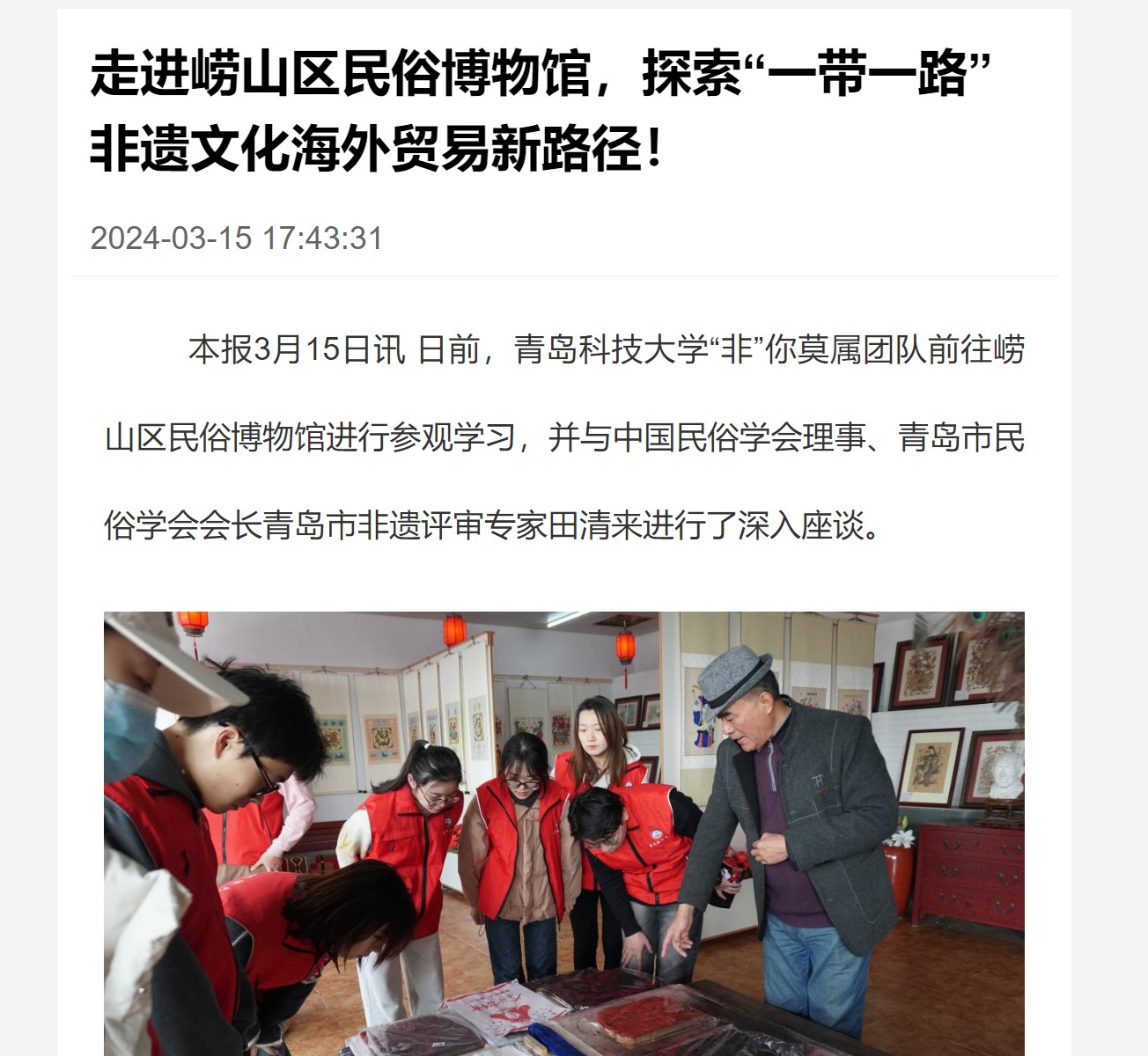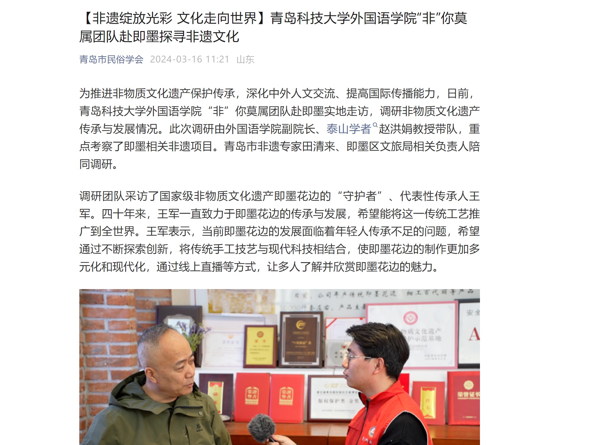 从“让非遗不再遗憾”到“鼓励非遗海外传播”,我国的非遗传承人和有志青年们不忘初心,在双创的路上让非遗重新“活”起来。2024年3月,beat365中文唯一官网副院长,泰山学者赵洪娟教授指导带领的“非”你莫属团队积极响应时代号召,开启探索中国非物质文化遗产海外传播新征程。他们深入崂山区民俗馆、李沧区文化馆、即墨花边博物馆、即墨古镇等地,与数位非遗传承人展开深入交流,共同探索非遗文化走向世界的新思路新途径,争做“一带一路”非遗海外文化传播破局者。受到中国社会科学网、中国网、中广中文网、今日头条、半岛新闻、青岛市民俗学会、掌上青岛等国内多家媒体报道,引发社会广泛关注。