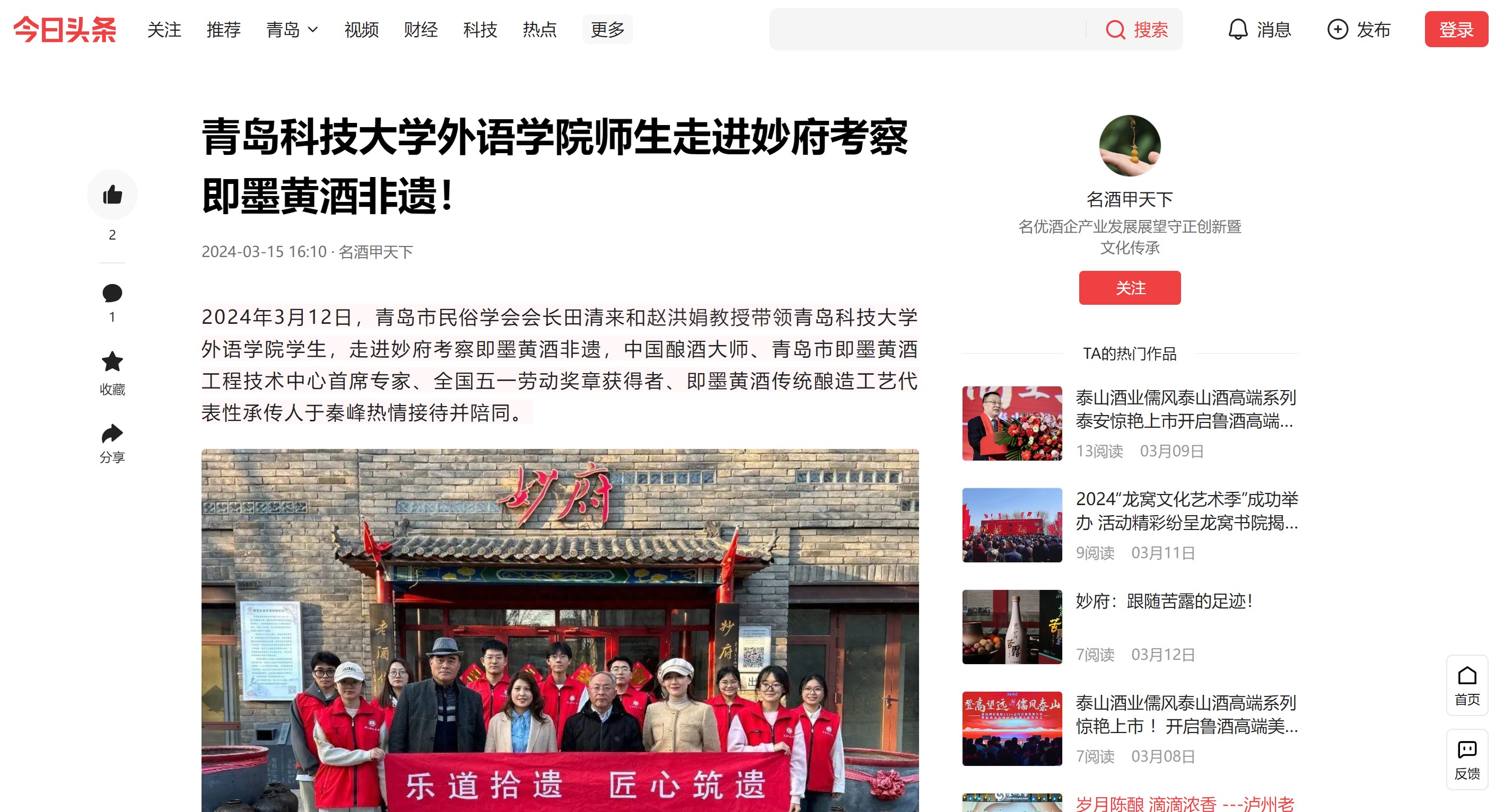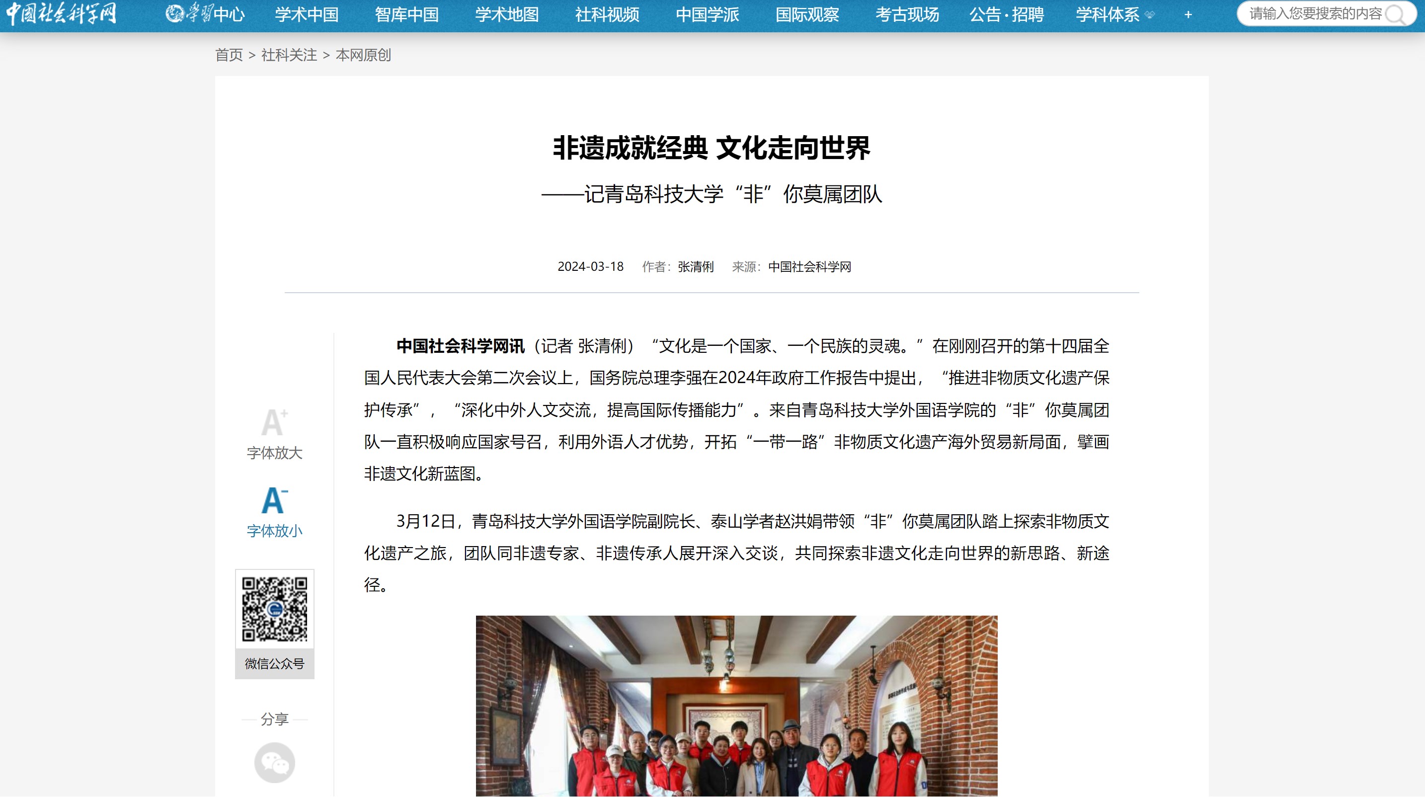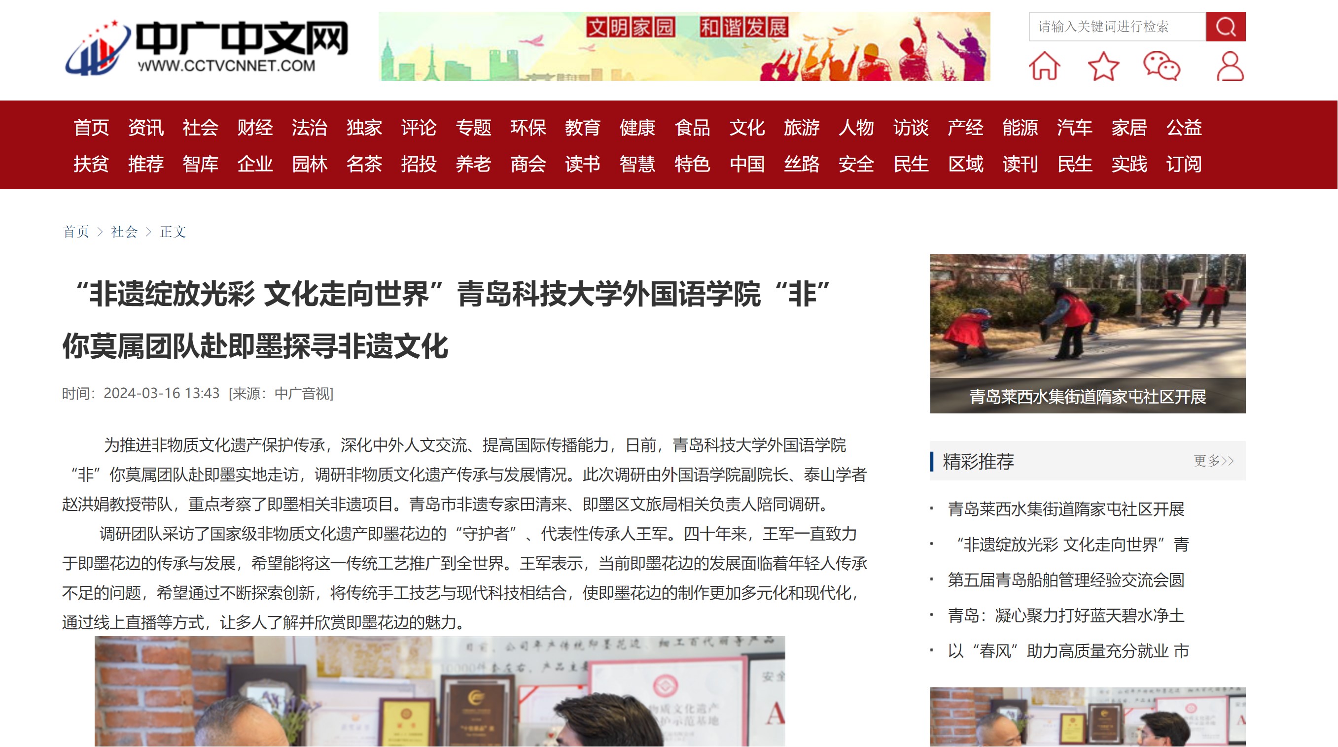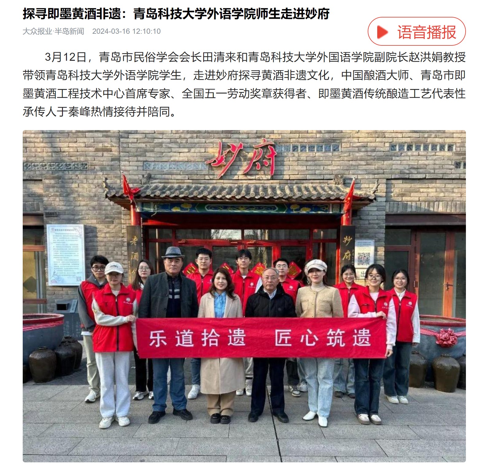 从“让非遗不再遗憾”到“鼓励非遗海外传播”,我国的非遗传承人和有志青年们不忘初心,在双创的路上让非遗重新“活”起来。2024年3月,beat365中文唯一官网副院长,泰山学者赵洪娟教授指导带领的“非”你莫属团队积极响应时代号召,开启探索中国非物质文化遗产海外传播新征程。他们深入崂山区民俗馆、李沧区文化馆、即墨花边博物馆、即墨古镇等地,与数位非遗传承人展开深入交流,共同探索非遗文化走向世界的新思路新途径,争做“一带一路”非遗海外文化传播破局者。受到中国社会科学网、中国网、中广中文网、今日头条、半岛新闻、青岛市民俗学会、掌上青岛等国内多家媒体报道,引发社会广泛关注。