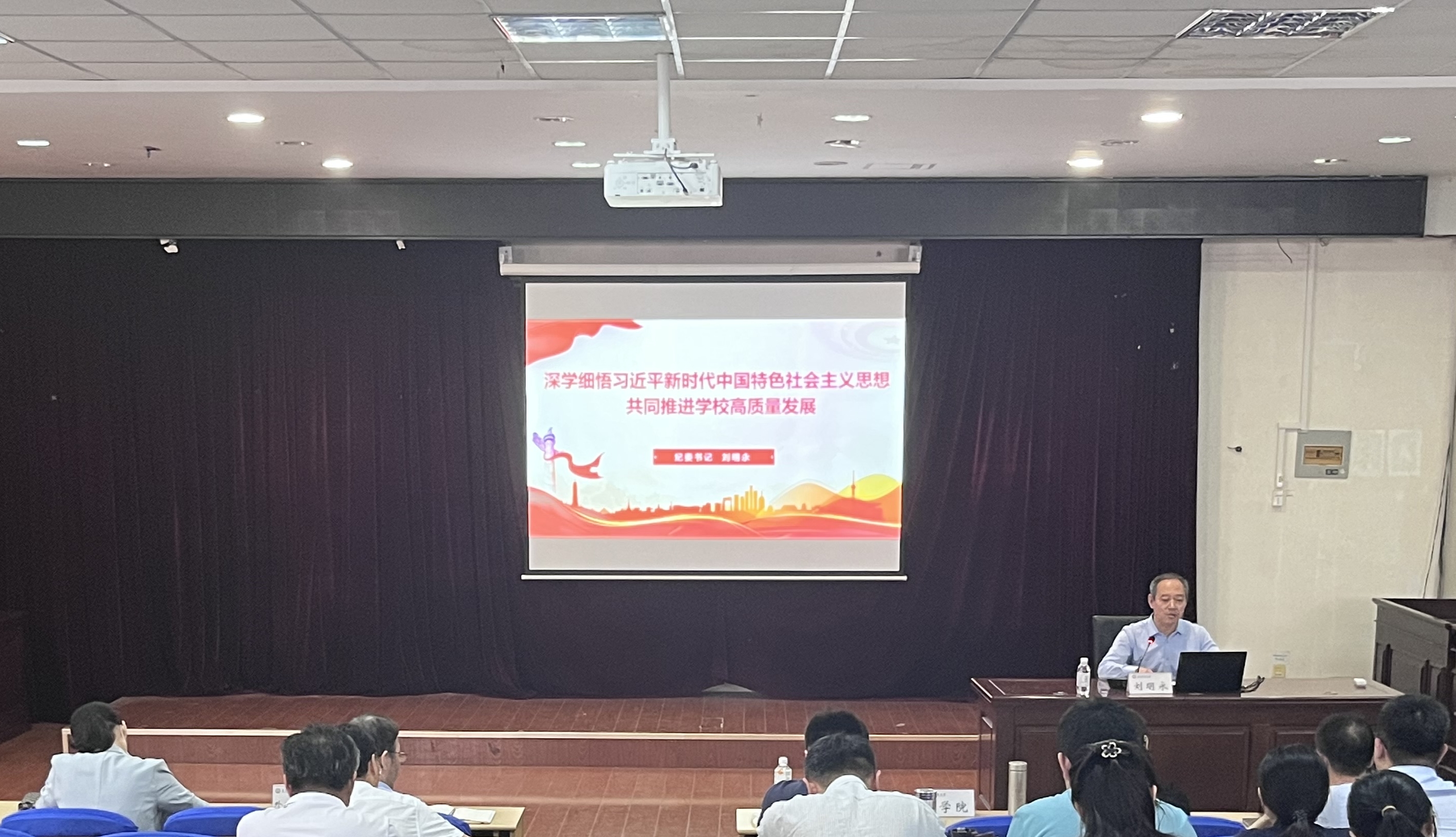 刘明永以《学深细悟习近平新时代中国特色社会主义思想 共同推进学校高质量发展》为题,围绕讲纪律和谈发展两个方面进行重点讲授。从全面从严治党永远在路上和党的自我革命永远在路上的高度,讲授了对以党的自我革命引领社会革命的认识与理解,深入讲解了抓关键少数在党的自我革命中的意义,要求党员干部和广大党员自我要求从严,以自我净化、自我完善、自我革新、自我提高的精神发挥先锋模范作用,在平常时候看得出来、关键时刻站得出来、紧要关头豁得出来。要求党员干部和广大党员要立足教师本职,深入学习贯彻习近平总书记关于教育的重要论述,在高等教育综合改革领域共同发力,积极投身增强文化自信的伟大实践和学校改革发展的具体实践,主动探索校院两级管理体制改革,以学院办大学的勇气和担当,在推动“特色鲜明、走在前列”的高水平大学建设中立新功。