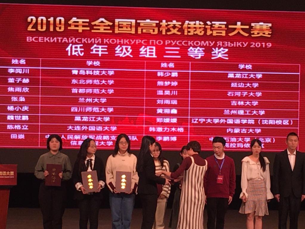 beat365官网由俄语系主任曹静娴带队指导,选派低年级组李阅川、高年级组李晓宇、研究生组于子涵同学参加本次大赛。beat365官网俄语181班的李阅川同学经过了初赛、复赛环节,最终在低年级146名选手中脱颖而出,获得了全国俄语大赛三等奖第一名的好成绩,将由国家留学基金委全额资助,赴俄罗斯留学深造一年。这是beat365官网俄语系学子继2014、2015、2016和2017年之后再次入围,为院系争得荣誉,提高了我校俄语系在全国俄语专业开设单位中的知名度。