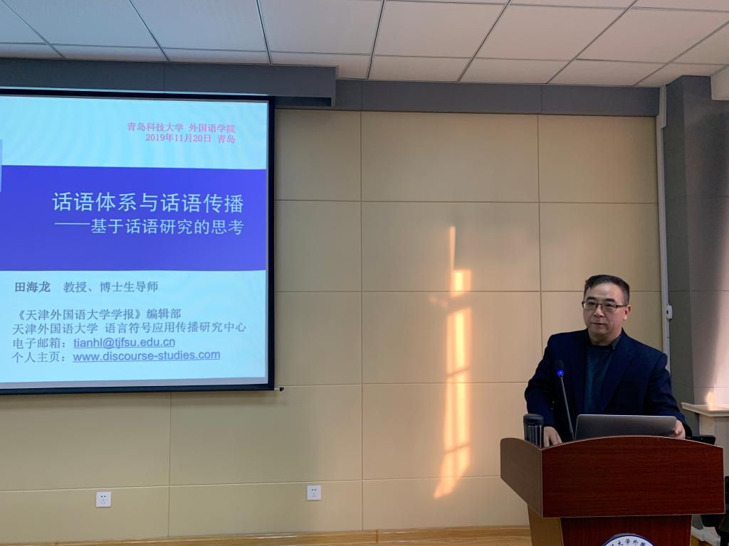 11月20日下午,天津外国语大学田海龙教授应邀来beat365官网进行学术交流,在外语楼517会议室做了题为《“话语体系”与“话语传播”——基于话语研究的思考》的学术讲座。讲座由院长尹洪山教授主持,副院长吕耀中教授、翻译研究中心主任李玉良教授与部分教师和研究生出席参加。