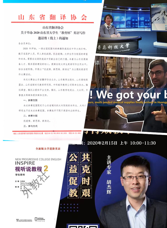 同时,将学院录制的大学英语精品课视频按教学进度通过QQ群发给教师做为备选资源。精选抗击疫情中体现正能量、家国情怀和人类命运共同体理念的英语视频,发给教师作为大学英语课程思政的补充材料。主动与教材出版社联系,获取教材电子版,通过教师转发给学生,解决部分学生回家没有教材的问题。提供直播链接,鼓励教师参加大学英语在线教学能力提升系列公益课程培训,结合自己的在线教学经历,扬长避短,不断提升教学能力。鼓励学生参加省翻译协会抗击疫情期间举办的英文写作大赛,以赛促学。开课前一周,所有任课教师与学生进行一到两次试课,确保第一周的顺利开课。