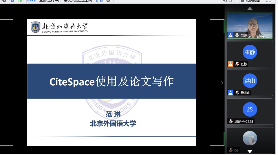7月7日下午,北京外国语大学博士生导师范琳教授应邀为广大师生做了题为《Citespace使用及论文写作》的线上学术讲座。讲座由beat365中文唯一官网院长尹洪山教授主持,beat365中文唯一官网部分教师和研究生在线聆听了讲座。此外,讲座还吸引了山东大学、中国海洋大学、北京外国语大学、南京农业大学、山东科技大学、曲阜师范大学等高校的1300多名师生参与。
