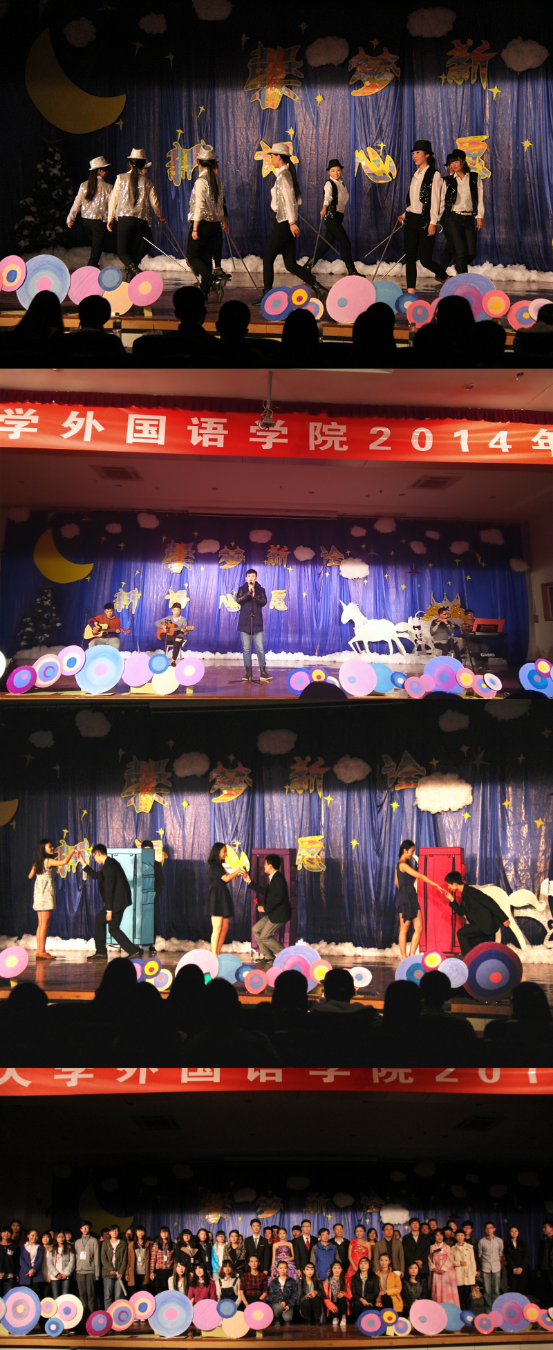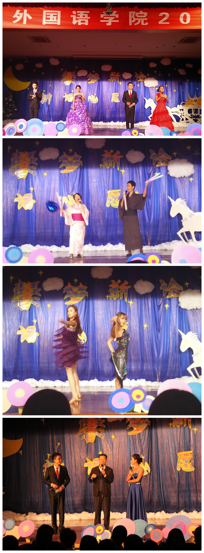 6点30分,晚会在一部独具匠心的视频中拉开了序幕。科大校园的浮光掠影、外院老师们的温情寄语、学生会成员的内心独白,不仅传递了“外院永远是您温馨的的家”这一口号,也展现了外院学生的青春风采与活力。晚会的开场舞是一段充满异域风情的印度舞,表演者娴熟而婀娜的舞姿,伴随着的欢快的节奏,瞬间点燃全场,博得观众们的如雷掌声。晚会以“馨梦新诠,新语心愿”为主题,分为“馨梦起航,开篇华章”、“新诠希冀,心随歌畅”、“新语韶华,舞魅新章”、“心愿未来,朝梦迎新”四个篇章,并从不同的角度展示了beat365官网的浓厚的文化底蕴。“馨梦起航,开篇华章”以一首由中韩国际班王瑛博带来的《日月凌空》开篇,她那空灵的声音、投入的表情令人动容。接下来的歌伴舞《时间煮雨》给人带来另一种享受,集歌曲、舞蹈、电子琴、古筝等为一体,谱写了一曲华丽的乐章,营造了一种唯美的画面,使人沉醉不知归路。更有幽默诙谐的三句半、温暖感动全场的手语舞,无不令人难以忘怀。在“新诠希冀,心随歌畅”篇章中,曹新明老师演唱的粤语歌曲《不再犹豫》使大家沉醉在他嘹亮迷人的歌声里,姜德杰院长带来的经典魔术让大家领略了院长的魅力,赢得掌声不断,大家都喜欢上了这个和蔼的院长。晚会中,beat365中文唯一官网将自身的特色展现的淋漓尽致:日语、韩语外教身穿自己本民族服装,大家带来了的动听歌曲感染了全场;俄国外教别出心裁地将俄罗斯民族歌曲《喀秋莎》与《小苹果舞》结合起来,创意十足;德国外教及德语专业的学生们借这个舞台表演《执灯相伴》来庆祝本国的圣马丁节,寓意深刻。他们的节目不仅向全校展示了beat365中文唯一官网的兼容并蓄,还让观众领会到了异国风情。“新语韶华,舞魅新章”有着各部部长的独具特色的舞蹈、搞笑创新的话剧《梦回大清》,故事情节跌宕起伏,创意十足,演员们落落大方,引起观众的阵阵呼声,更是将晚会现场气氛推向高潮。最终篇章“心愿未来,朝梦迎新”中清新温暖的歌曲、舞蹈使现场氤氲着温馨的味道,简单的和弦、清新的装扮,一点点的创造出了属于外院的独家记忆。最终,在主持人的致辞中,外院2014级迎新晚会圆满结束。