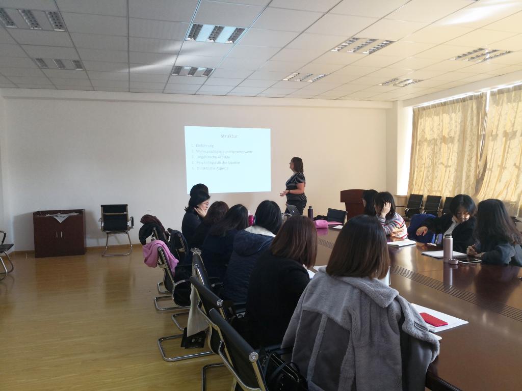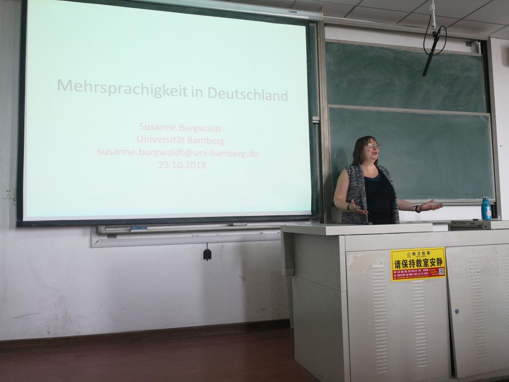 10月27日至11月3日,德国班贝格大学Susanne Borgwaldt教授应邀在beat365官网进行了为期一周的访学,期间共举办了三场学术报告,主题分别为《德国的多语化(Mehrsprachigkeit in Deutschland)》、《德语构词法之复合词(Wortbildung-Komposition)》和《二语习得研究心得(L2-Erwerb)》,并围绕《多语化和第三语教学(Mehrsprachigkeits- und Tertiärsprachendidaktik)》这一主题开展了为期三天的教师培训,beat365中文唯一官网德语系全体教师及部分中德科技学院、中德双元工程学院的德语教师参加了此次培训。经过一周的学习与交流,师生们都感到受益颇丰。