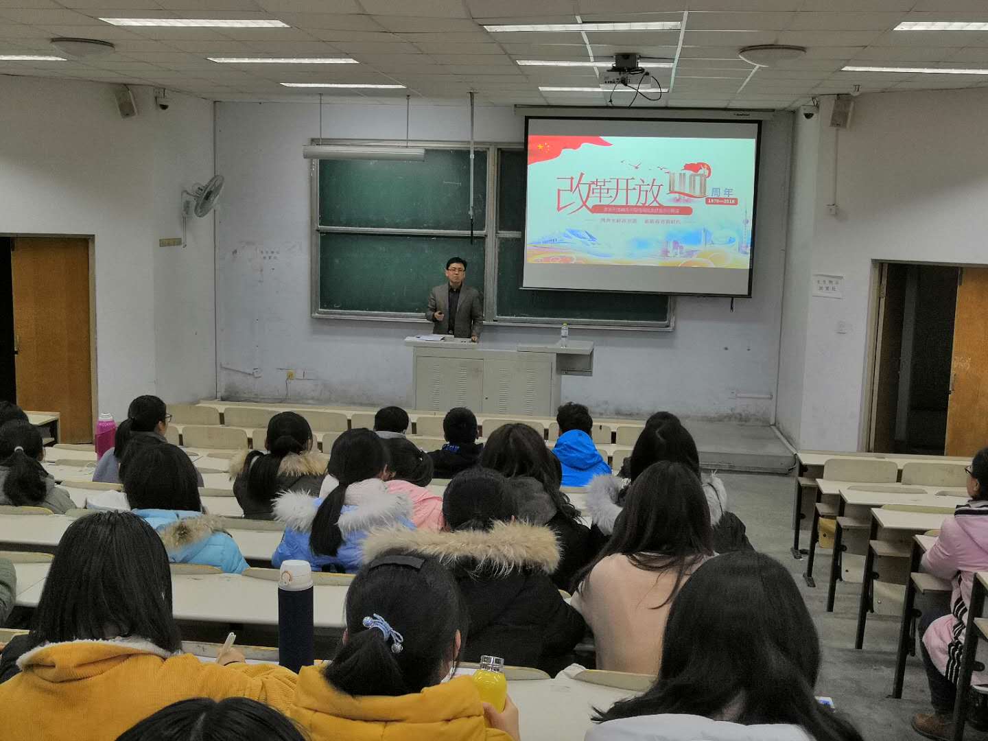 上好形势政策课。下午,党总支书记张洪坤为全体大一学生上了一堂生动的形势政策课。他从改革开放四十年的历史进程和辉煌成就两个方面,带领大家回顾了祖国改革开放四十年的巨大成就,并对同学们提出了三点要求:一是希望认真把握国际形势,做有理想、有道德、有文化、有纪律四有新人;二是要不断提高综合,为祖国的发展添砖加瓦;三是要面向未来,勤于思考,肩负起振兴中华的重任。