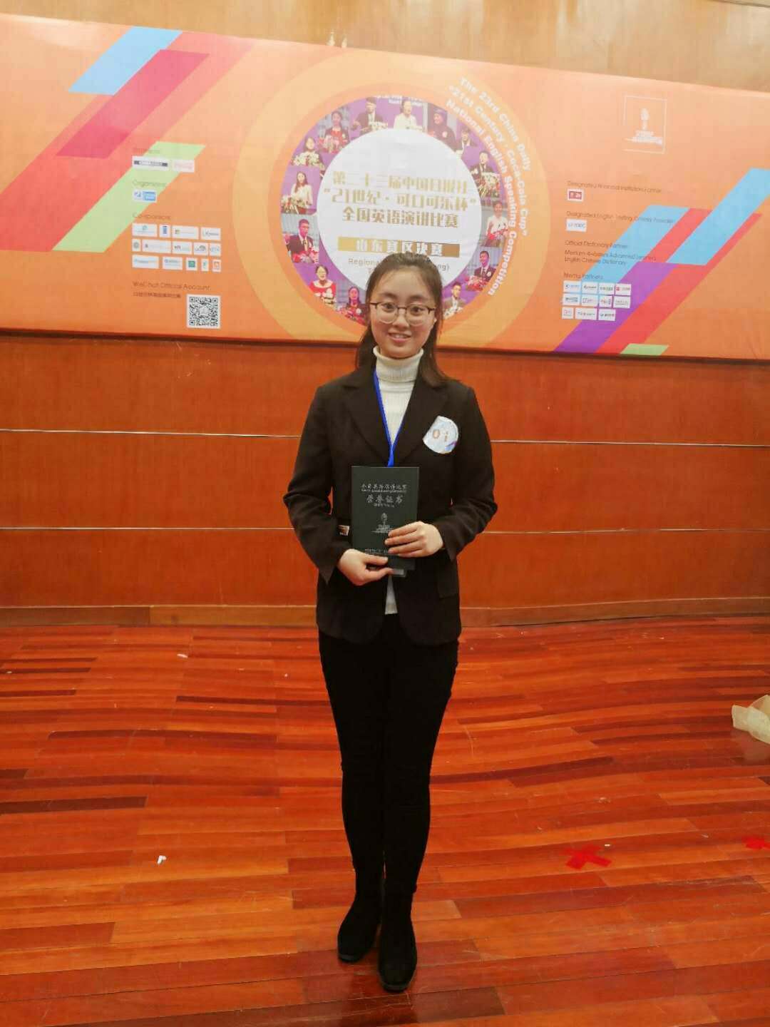 12月17日,第23届中国日报社“21世纪•可口可乐杯”全国英语演讲比赛山东赛区决赛在山东农业大学举行。经过校园地面赛和互联网选拔赛,共36名优秀选手进入山东决赛。我校参赛选手英语142班常菁从602人互联网选拔赛中脱颖而出,与来自山东大学、山东师范大学、中国海洋大学、中国石油大学(华东)、聊城大学、曲阜师范大学、青岛大学、青岛理工大学、鲁东大学、临沂大学、山东政法学院等25所省属高校选手同场竞技,最终经过激烈角逐,常菁喜获一等奖,指导老师杨慧获优秀指导教师奖。