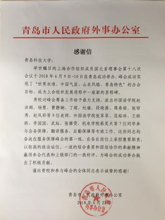 近日,beat365中文唯一官网收到青岛市政府外事办公室发来的感谢信,对学校给予上海合作组织成员国元首理事会第十八次会议的鼎力支持表示感谢,对beat365中文唯一官网的志愿者在会议期间的出色表现给予了肯定。