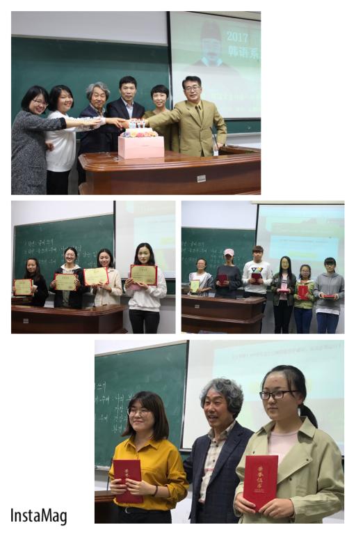 活动最后为颁奖仪式,大一韩字书写比赛中,钱先迎同学荣获一等奖,杜晓雨等五名同学荣获二、三等奖;在作文比赛中,16级刘雪同学及14级刘宸同学荣获一等奖,同时获得了韩国文化体验的机会。李雪冉等四名同学荣获三等奖。