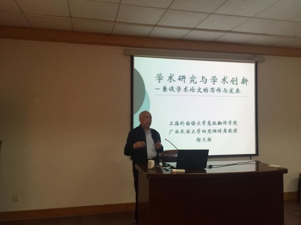 10月19日下午,上海外国语大学高级翻译学院翻译研究所所长、国内著名比较文学专家与翻译理论家、博士生导师谢天振教授应邀来我校beat365中文唯一官网与广大师生分享了翻译研究的最新动态,以及自己对学术创新与学位论文写作的真知灼见。报告会由beat365中文唯一官网院长尹洪山主持,院党总支书记姜德杰、副院长吕耀中、康宁及近百名教师及研究生参加了报告会。