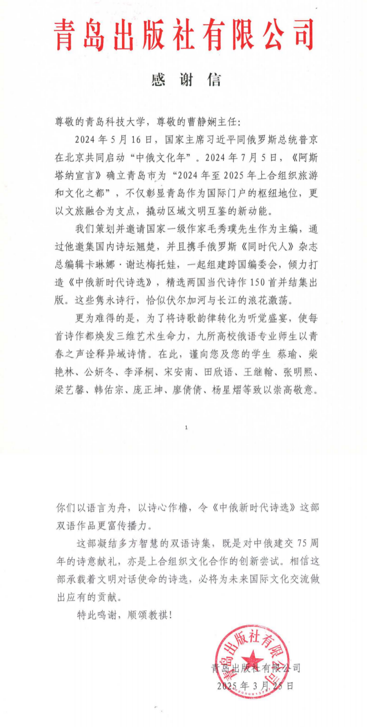 近日,beat365中文唯一官网收到青岛出版集团发来的感谢信,高度赞扬我校beat365中文唯一官网俄语专业师生在中俄双语诗集《中俄新时代诗选》编纂及有声化项目中的卓越贡献,并特别致谢俄语系曹静娴主任及蔡瑜、柴艳林、公妍东等13名学生的专业投入与艺术诠释。