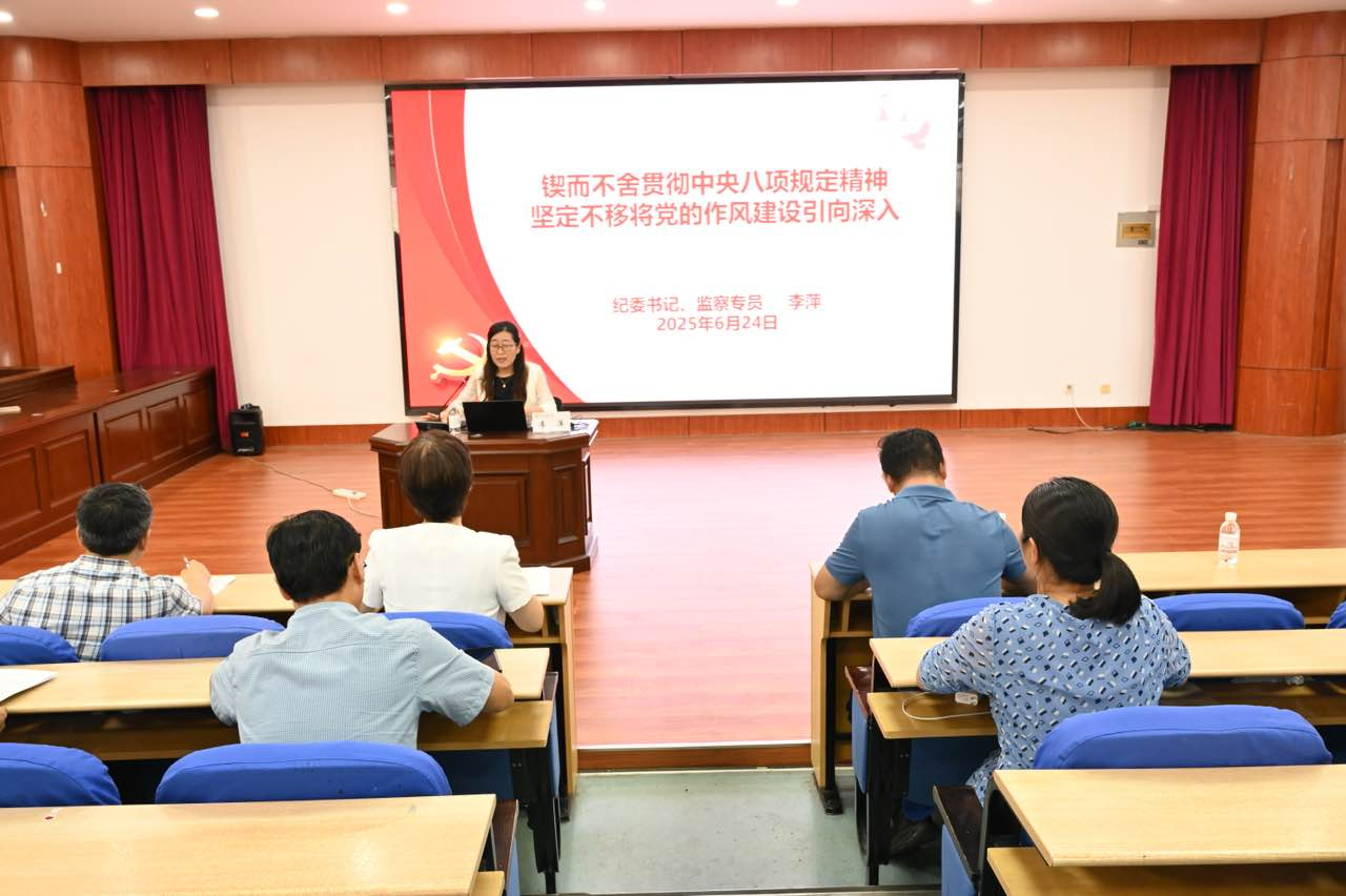 6月24日下午,学校党委常委、纪委书记、省监委驻beat365中文唯一官网监察专员李萍为纪检监察机关、beat365中文唯一官网、法学院师生党员讲授深入贯彻中央八项规定精神学习教育专题党课。