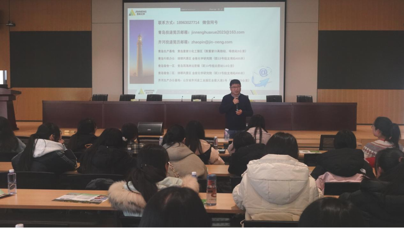 金能化学(青岛)有限公司是一家资源综合利用型、经济循环式的新材料及新能源企业。师生一行在金能化学(青岛)公司总经理伊国勇陪同下,参观了公寓楼、行政楼,深入了解了公司的企业文化。