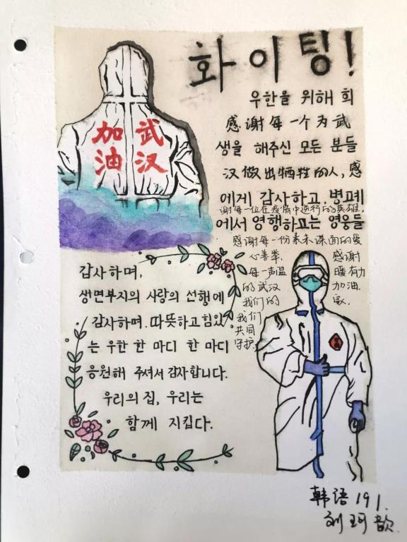 外院学子利用专业优势积极开展关于防控阻击此次疫情的主题性书写致敬活动,以五种不同的语言,向奋战在一线的人们表达崇高的敬意。同时,组织拍摄了多种语言的加油视频,用所习所得以实际行动为爱发声。面对疫情我们应该做的是有难一起扛,齐心协力战胜病毒,隔离的是疫情,但不能隔离的是爱!摒弃偏见、拒绝冷漠,湖北不孤单,我们“语”你在一起!我们坚信没有一个冬天不可逾越,没有一个春天不会来临。