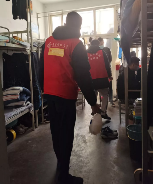 消杀完成后,校团委志愿者、校学生会主席团成员刘晓阳在南区四号楼前进行日常消毒专项培训,并发放了校团委调配的防疫物资,告知突击队成员们物资使用说明和疫情防控注意事项。