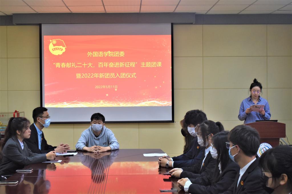 在庄严的国歌声中,2022年新团员入团仪式正式开始。王雨昕老师主持此次仪式并宣布新团员名单。张湘钧老师为韩语191班张明钰、日语202班李悦菡、俄语211李彤、韩语211唐佳璇、日语211周子怡五位新团员佩戴团徽。随后,新团员集体宣誓,从佩戴上团徽的这一刻起,新团员们铭记自己肩负的责任,努力履行团员的义务,用实际行动来表明自己无悔”共青团员“这个光荣的称号。张湘钧老师领学《中国共产主义青年团章程》团员义务和权利,新团员表示会积极履行团员义务,在活动中起模范作用。接下来,韩语191班张名钰同学代表新团员发言,她代表全体新团员作出承诺:发扬共青团的优良传统,以团员的标准严格要求自己,用热情谱写辉煌。韩语211时心仪同学作为老团员代表发言,她向团员们发出三点倡议,呼吁团员们珍惜青春年华,崇尚科学,追求真知,为团徽增辉,为团旗增色,为实现共产主义事业而奋斗。伴随着全场齐唱共青团团歌,本次主题团课暨入团仪式顺利落下帷幕。