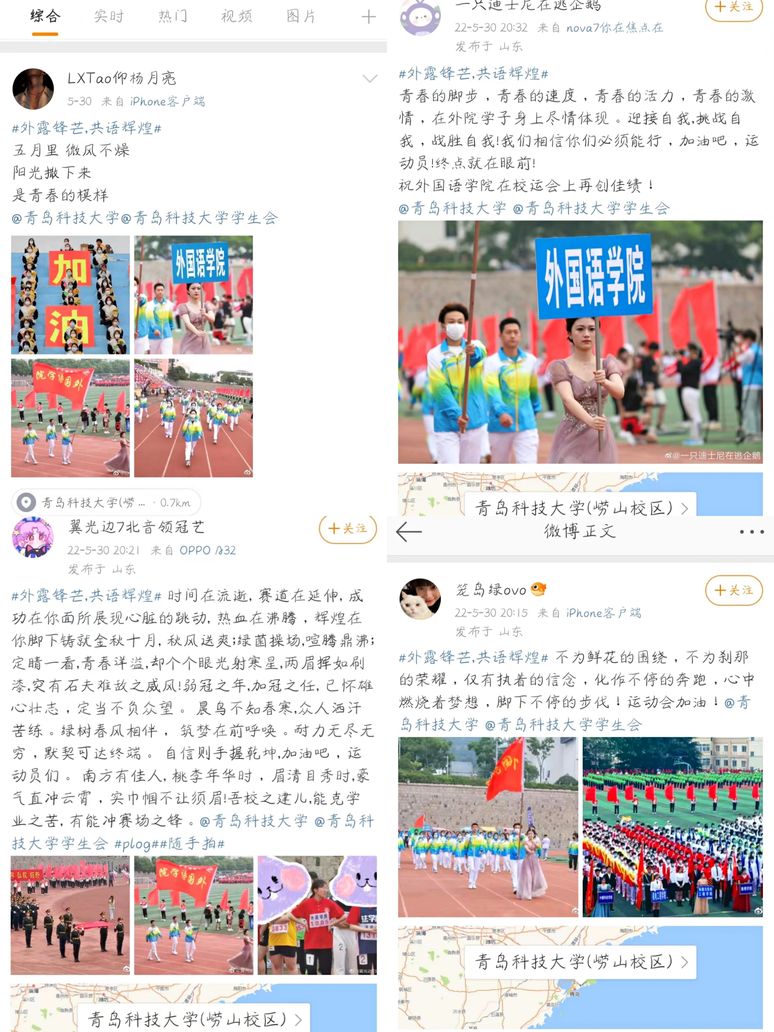 在此次活动中,同学们在#外露锋芒,共语辉煌#的话题之下纷纷打卡,分享着自己参加排舞、跳绳展演和方队入场等的现场画面和感受,其他同学作为观众也为beat365中文唯一官网的运动健儿们点赞,抒发了观赛一天的真实感受。不少同学还配上了运动会期间拍摄的照片,不仅鼓舞了士气,也展现了外院学子们青春活泼的风貌。