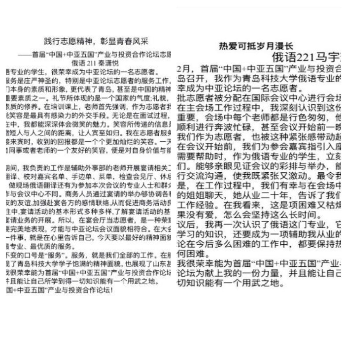 这是我第一次参加国家性的志愿服务活动,全程下来我是十分激动的。中国和中亚五国多年来友好合作,共同发展。在志愿服务的过程中,我不仅更深层面了解到志愿活动的重要性和意义以及一些要求,而且我还更深的体会到中国和中亚五国的各个方面的合作。