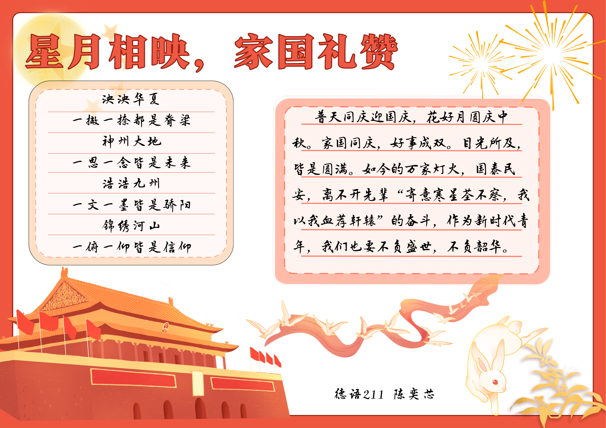 为积极弘扬中华优秀传统文化,深入学习党的二十大精神,准确把握时代脉搏,强化使命担当,厚植爱国情怀,beat365中文唯一官网开展“喜迎国庆 青春向党”文艺作品征集活动。通过文艺作品传达爱国主义精神,强调国家的团结和统一,培养了外院学子对国家的热爱和忧国忧民的情感。