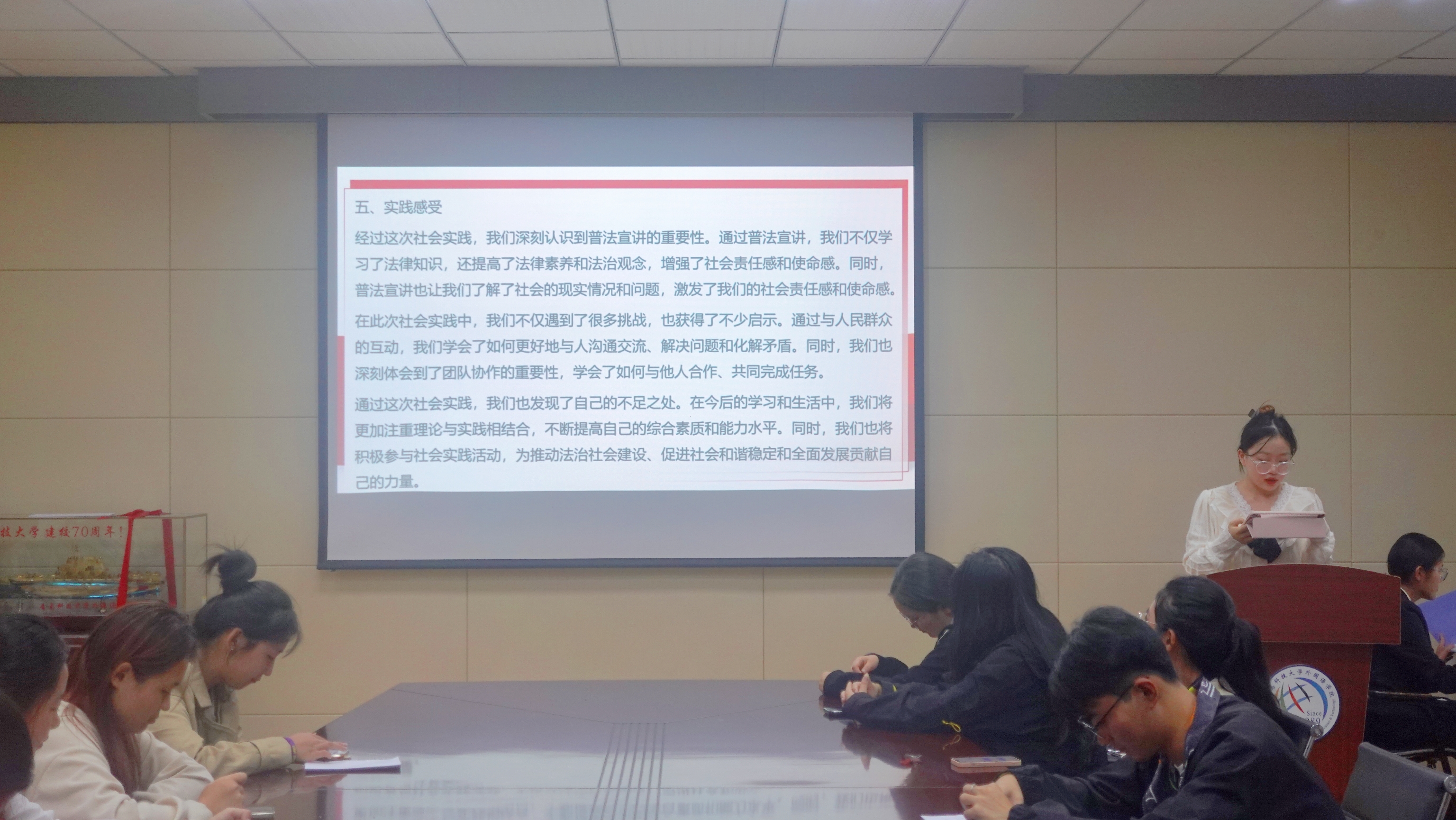 本次座谈会特别邀请了校级社会实践优秀团队代表德语211王茜琳同学为同学们展示了她所在的“‘懂法守法,普法传法’beat365中文唯一官网法治入社区”调研团队的成果。王茜琳同学从准备阶段如何撰写实践方案、如何制作宣传物料,实施阶段如何制定议程、如何多方协调等方面展开经验介绍,让参与本次座谈会的同学受益匪浅。