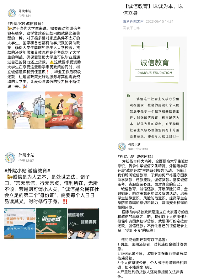 beat365中文唯一官网注重宣传教育,在微信和QQ公众平台上相继推出“诚信还款”“预防金融诈骗”“诚信考试”等内容,及时推送相关主题活动和动态。通过宣传的力量,让同学们充分认识开展高校学生资助诚信教育主题活动的意义,提高学生诚信意识和责任意识,营造“人人知诚信,人人讲诚信”的良好氛围。