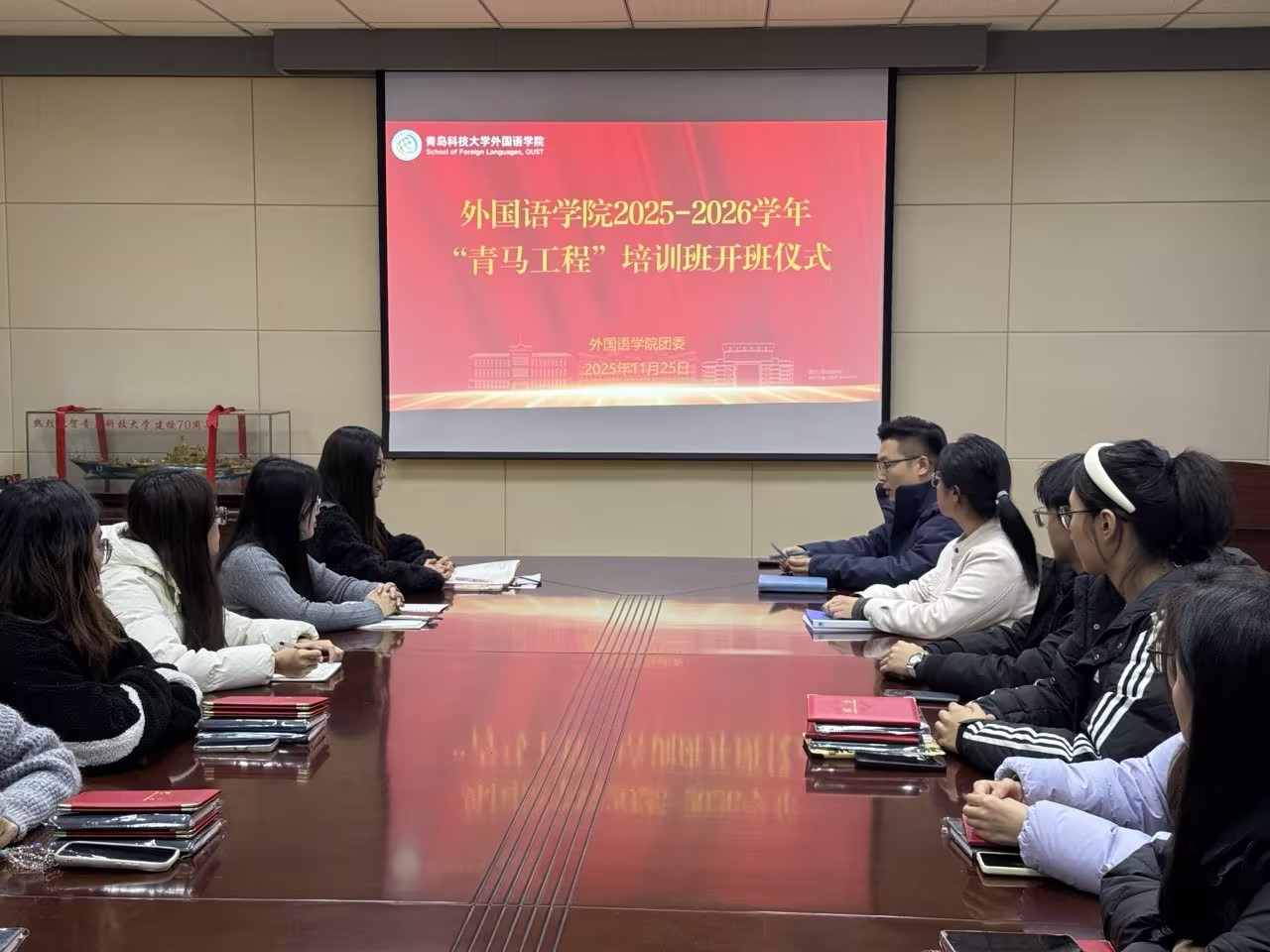 11月25日,beat365中文唯一官网2025-2026学年“青马工程”培训班开班仪式在517会议室举行。学院团委副书记王玉凯主持仪式并讲话,往期青马优秀学员及本期青马学员共同参加仪式。