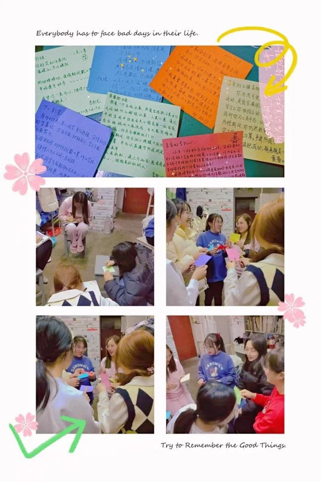 英语二学位班级的417宿舍由在本次活动中,各自分享了自己的一些高光时刻,宿舍瞬间变身“夸夸群”!大家都直抒胸臆,交流了抗疫防控期间的感想体会,心理委员还针对个别同学因疫情产生的负面情绪提出了一些建议,比如采用“积极的自我对话”、“正念冥想”、“行为放松”等方式,帮助其克服一些不良情绪。最后用笔和纸写下了对方的优点以及自己的祝福的话语。